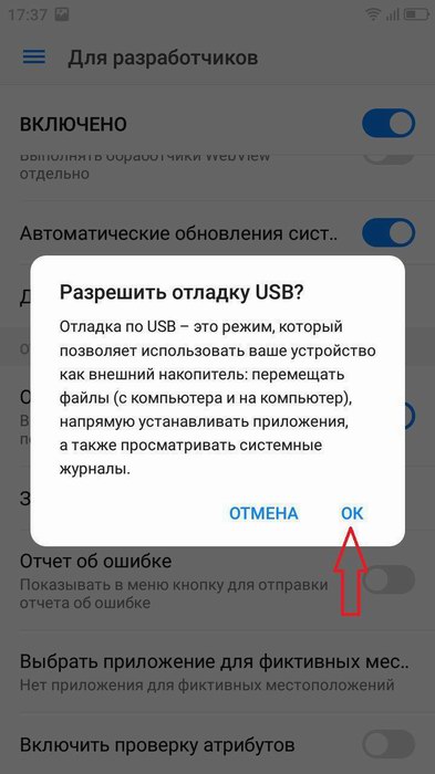 Betrachten wir zunächst die einfachste Methode, bei der ein Kabel verwendet wird. Beachten Sie, dass das USB-Debugging aktiviert sein muss. Zu diesem Zweck Entwicklermodus aktivieren.